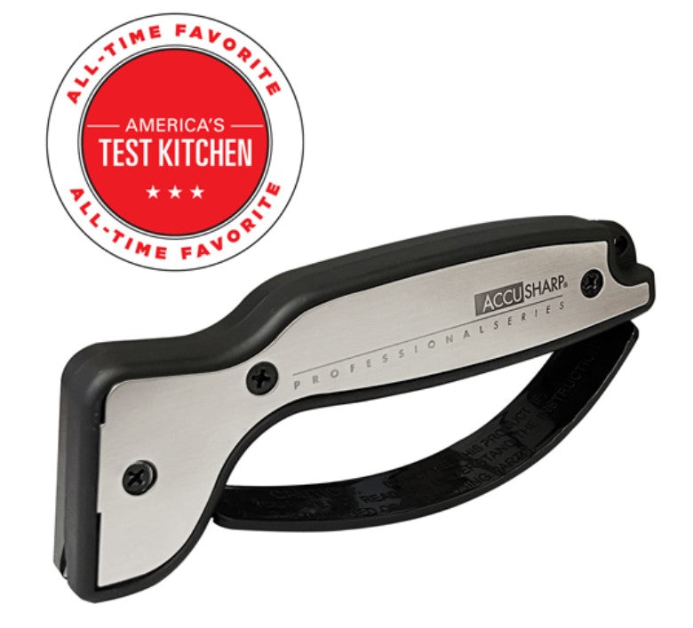 The AccuSharp® PRO Knife and Tool Sharpener sharpens knives (even serrated knives), cleavers, axes, machetes, and many other cutting tools in about 10 seconds. The large ergonomic handle is made of brushed aluminum finish and is framed with an over-molded rubber grip.