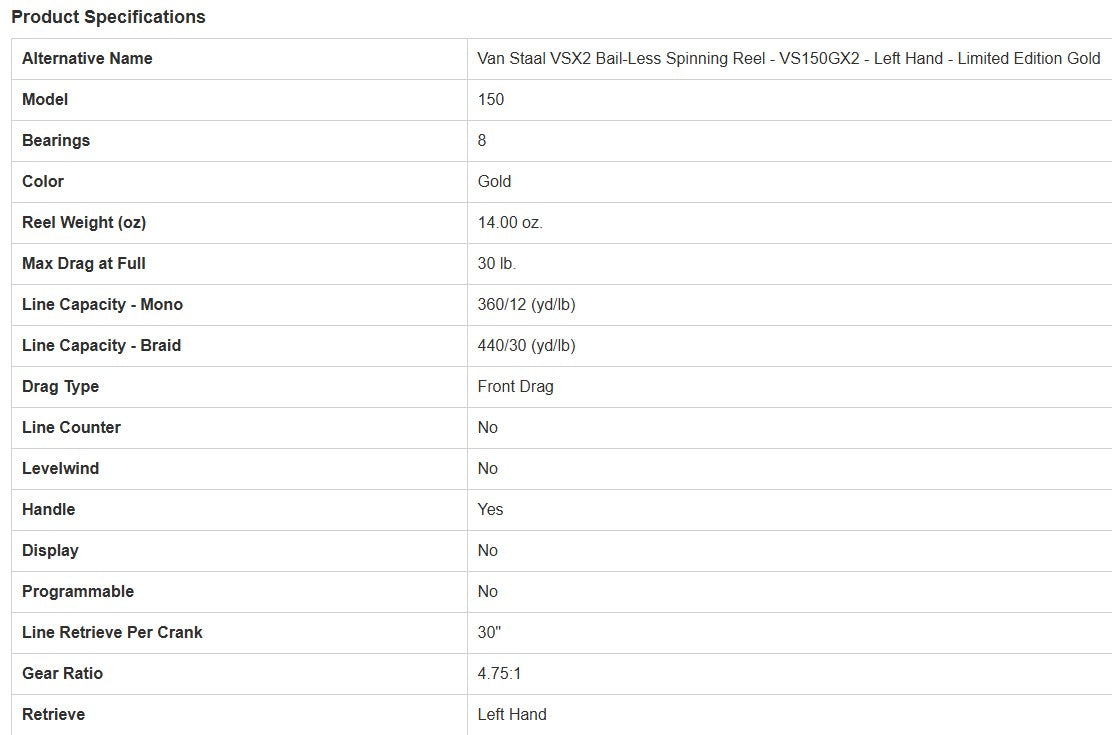 The Van Staal VSX2 Bail-Less Spinning VS150GX2 Reel has been the benchmark for durability and reliability for 30 years. The VS X2 Series is built on the VS foundation of simplicity and functionality and is made with the finest materials available for the No Limitations™ angler. The X2 retains all the features the VS Series reels have become known for while adding key improvements from top to bottom. New sizing rounds out the portfolio from back bays to the offshore tuna grounds. The new unibody design increases strength and sealing while the longer handle, power knob, and power drag knob increases both cranking power and drag pressure. The oversized clutch is now on the pinion side which results in immediate hook sets. With smaller and faster reels, the benefits of the VS X2 can now be experienced by the inshore angler. This model is part of a limited-edition production run of only 500 pieces, offering exclusive access to a high-performance reel with everything you expect from Van Staal.