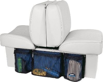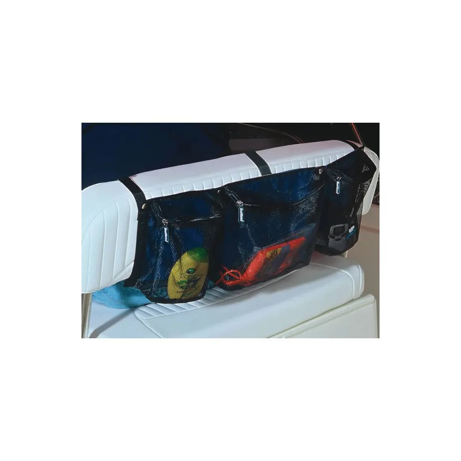 Heavy mesh pocket organizer can be mounted on back-to-back seat base or on rear of flip-flop style seats. Holds all those small items that clutter the deck during a day on the water. Use it to stow sun screen, CDs, magazines, tow lines, hand-held radios, etc. Made from commercial grade coated mesh and polyester materials. Self-repairing zippers with molded pulls make opening and closing quick and easy. Easy to mount with male-female snap fasteners for back-to-back seats, or quick release straps for flip-flop seats.