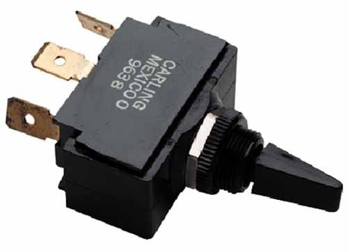 3 Position: On - Off - Mom. On 3 Blade type terminals. Single pole. Water resistant plastic housing.