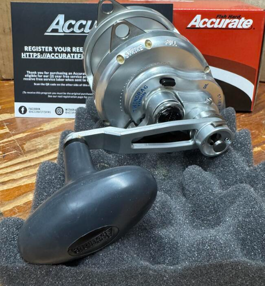 The Accurate Boss Extreme (BX2-30N) 2-Speed Narrow reel is a high-performance, American-made conventional reel featuring the patented TwinDrag® system for superior stopping power and smooth, consistent pressure. Designed for versatility, it excels in deep-sea, jigging, and bait fishing, featuring stainless steel gears and a 2-speed mechanism for switching between fast retrieval and high-torque