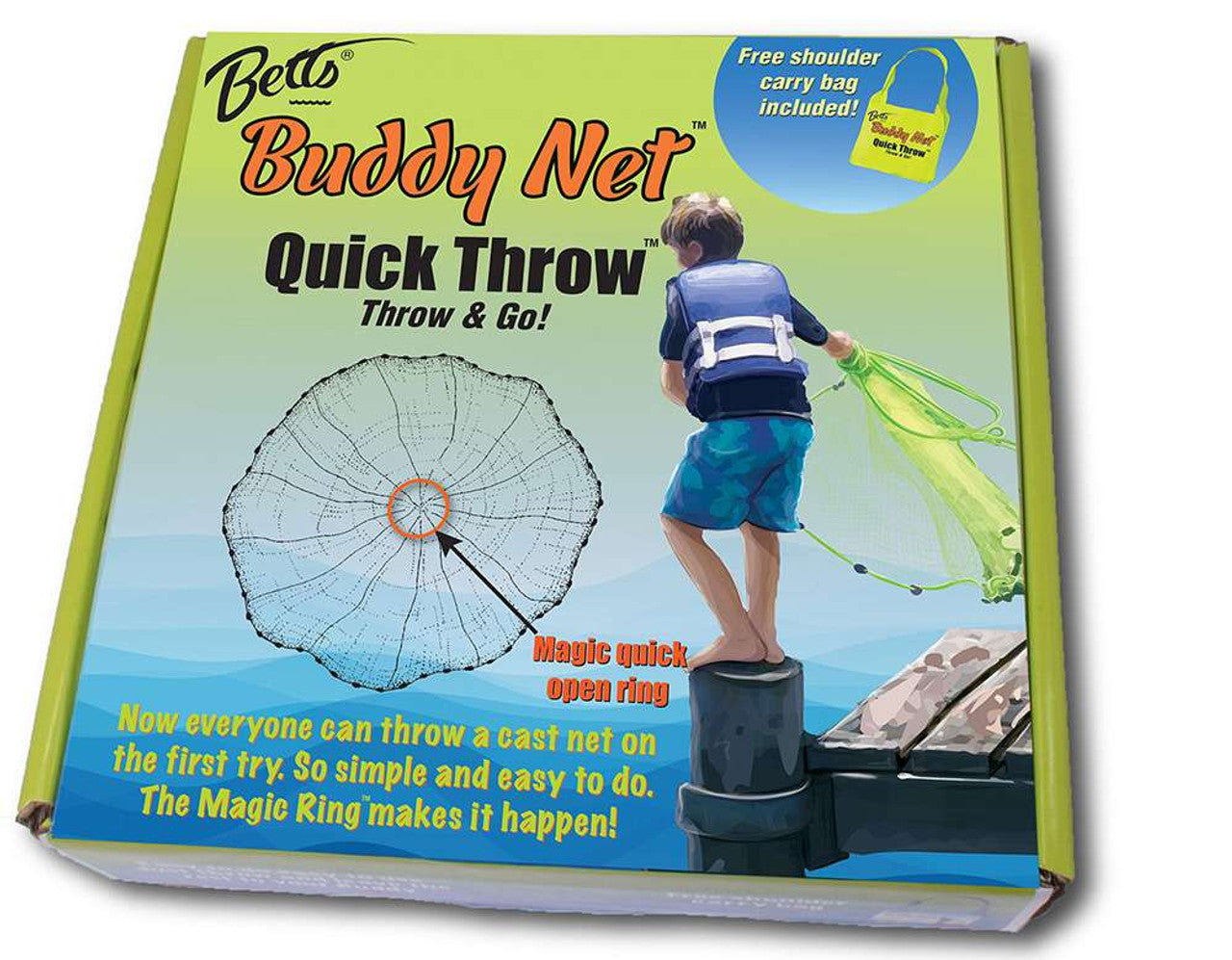 The Betts Buddy Cast Net is made with 3/8in mesh and has coated iron weights that total 3/4lb per square foot. It includes a shoulder carry bag. It's made with chartreuse monofilament line. It features a magic quick open ring. Feels and throws like a pro, very popular for kids.