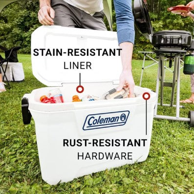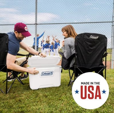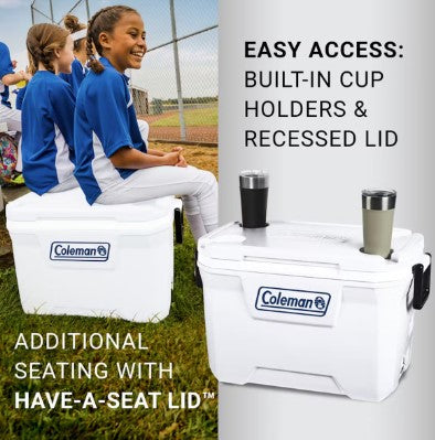 Inspired by our Wichita roots and the people who work there, the Coleman® Classic Series of hard coolers brings uncompromising quality and a legacy of craftsmanship and adventure wherever you take them. Food and drinks stay chilled longer with the Classic Series 52-Quart Marine Hard Cooler, which Keeps the Ice™ up to 3 days. Carrying a full load? Enjoy easier lifting with the swing-up side handles, then have a seat on the closed lid. Not to worry, cup holders built into the lid will keep your drink close and prevent spills. Made to withstand the challenging conditions of being on the water, the UVGuard™ coating helps protect the cooler from damaging sun rays. The stainless steel hardware prevents rusting and corrosion—extending the life of the cooler. With room for up to 80 cans, you'll easily fit refreshments and the day's catch on fishing trips.