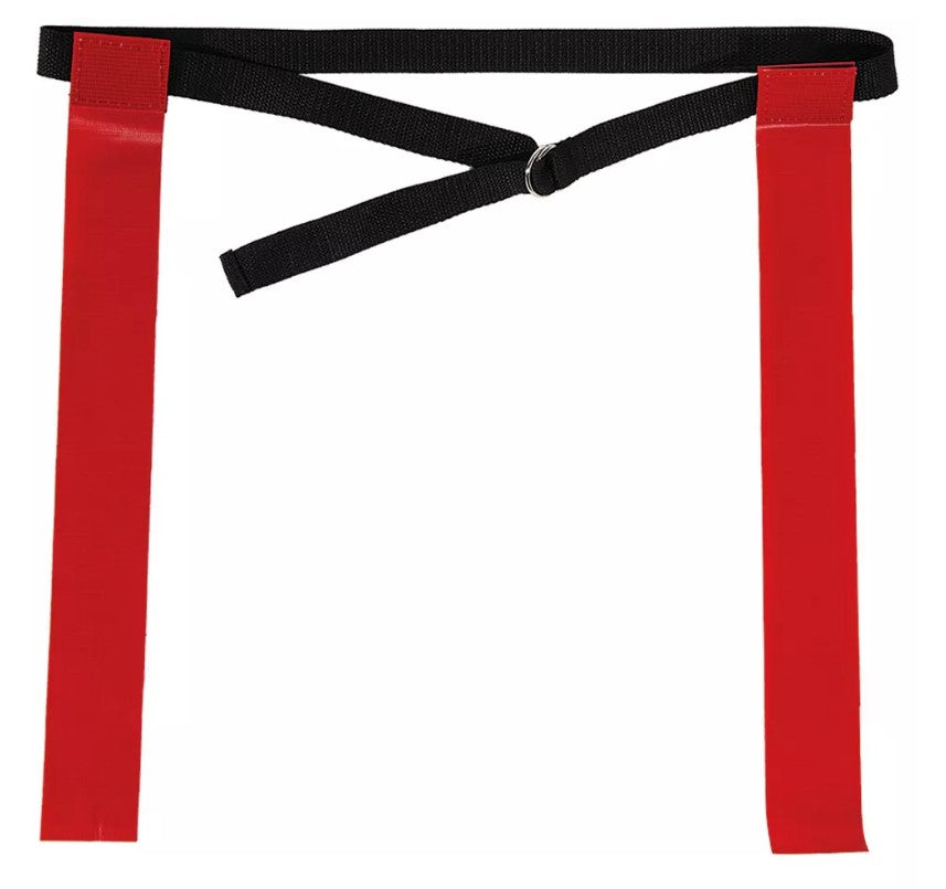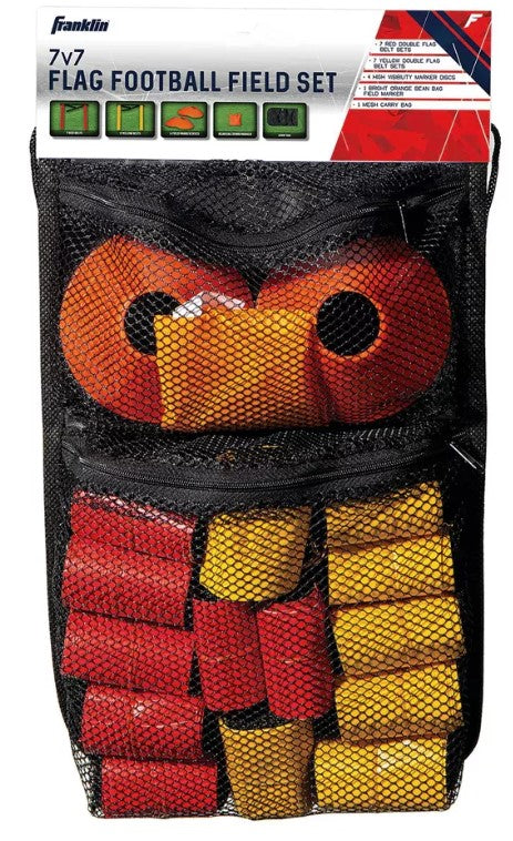 The Franklin Sports 7v7 Complete Flag Football Set with Carry Bag provides all the tools needed to field two adult teams and meets the demands for high intensity flag football. The set is designed with 14 heavy duty flag and belt sets comprised of 7 bright Red and 7 high visibility yellow flags to clearly provide contrast between teams. The flags are made from heavy duty tarpaulin, so they are waterproof and easy to maintain. They measure 18" L x 2" Wide and secure using self-stick hook and loop system that is easy to pull and quick to secure back on the belt. The 52" long belt is adjustable using rust proof D-Rings. The set also includes 4 high visibility field markers to ID the end zone plus a brightly colored bean bag field marker. The contents can be conveniently stored in a mesh bag with two zip compartments.