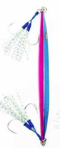 Mobster tri face slow pitch glow jig rigged with top and bottom assist hooks. This jig is deadly on all tunas as well as wahoo, kingfish and many other pelagics. When worked from the bottom all the way to the surface you can expect explosive bites however if targeting snappers, groupers, amberjacks and other bottom fish its best to work the jig from right on the bottom up 20ft to 30ft off the bottom. Long to medium sweeps of the rod with 1/2 turns of the reel will produce the bites you are looking for