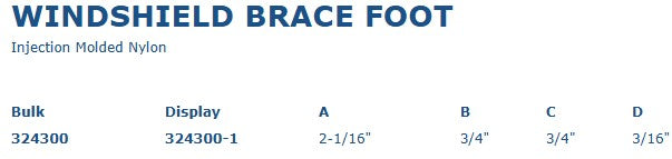 Constructed of UV resistant black injection molded nylon. This Windshield Brace Foot fits 1/2" ID tubing to support a windshield.