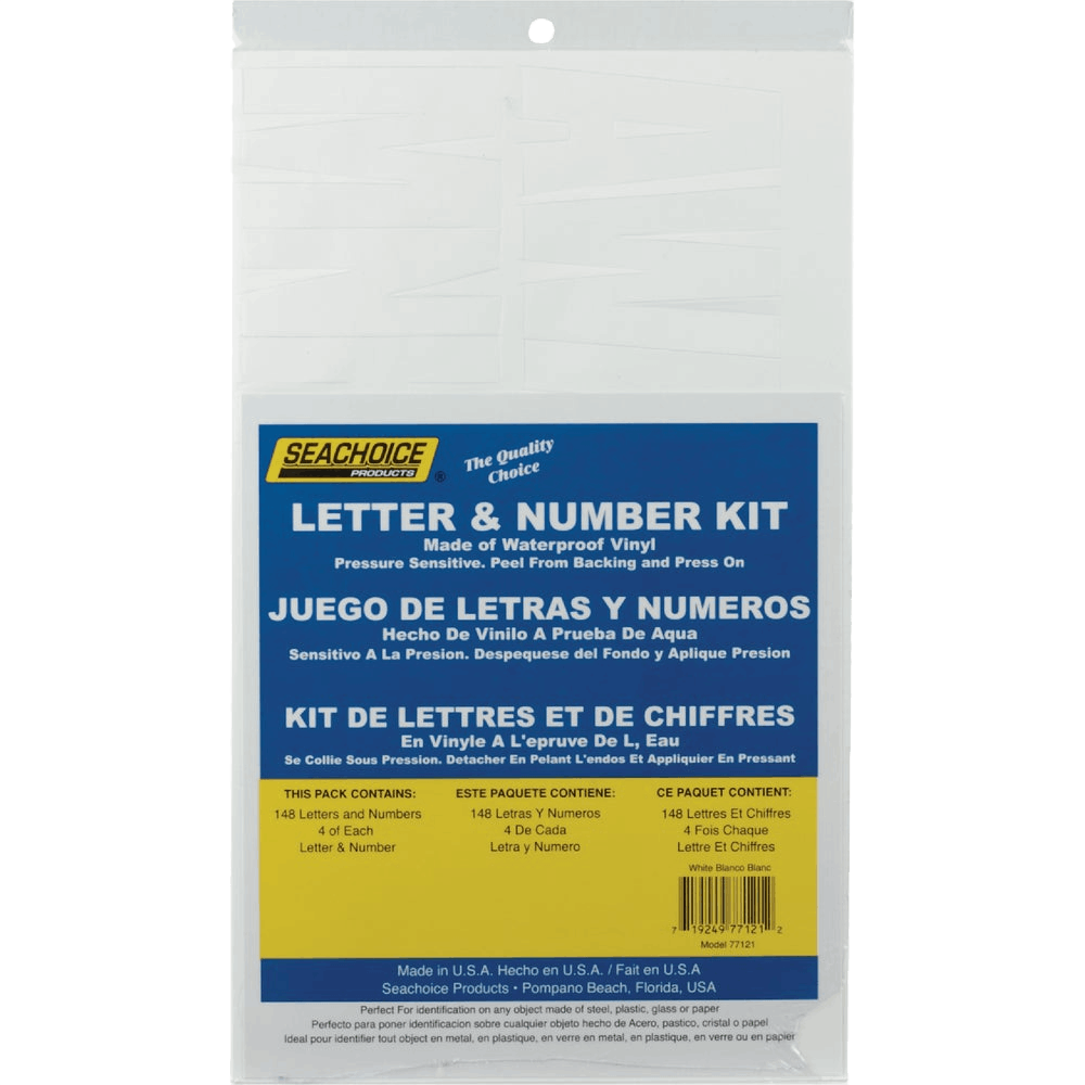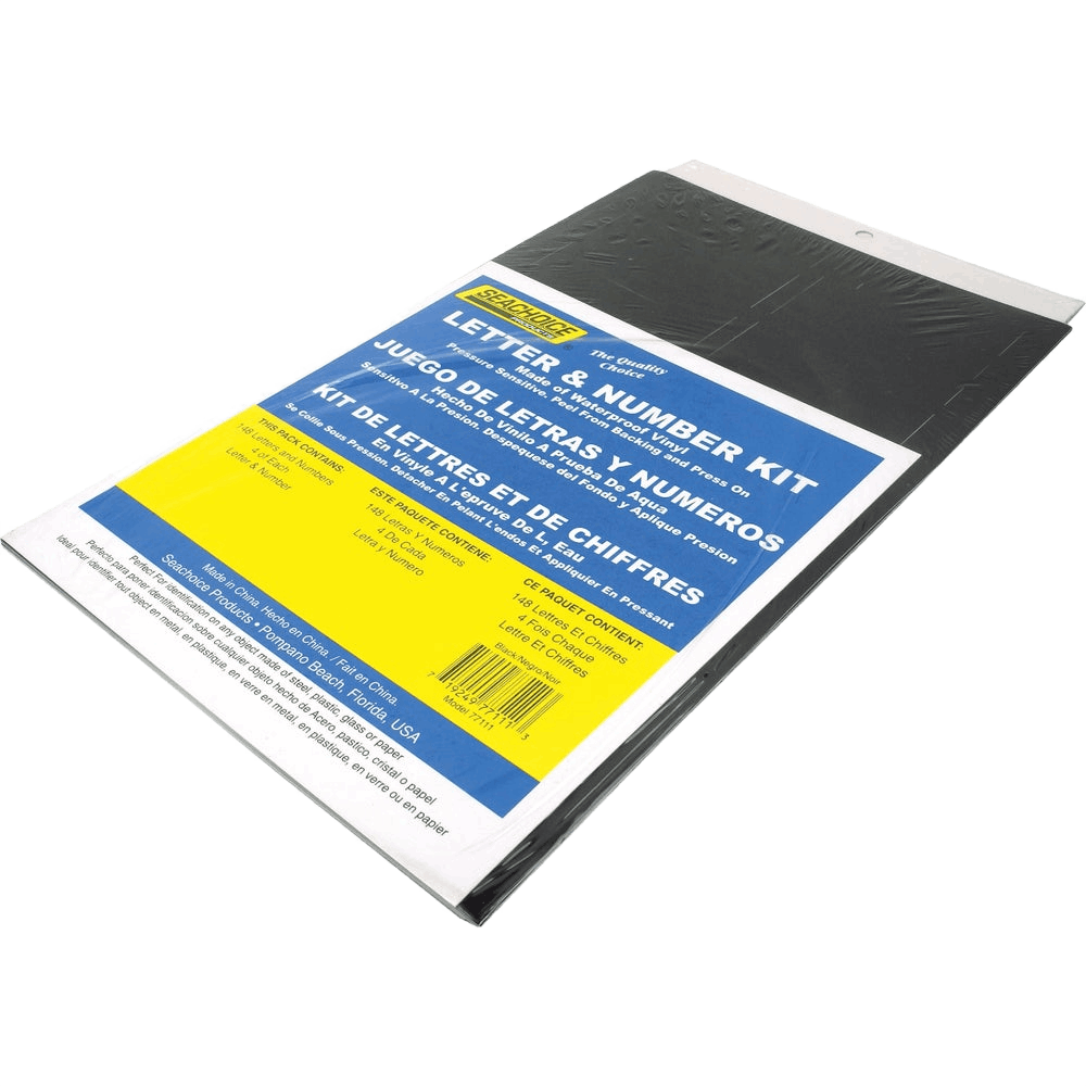 3-1/4-inch solid vinyl numbers and letters. Each kit contains 4 of each letter and number, totaling 148-pieces. Numbers and letters are pressure sensitive. Just peel off backing and press on.