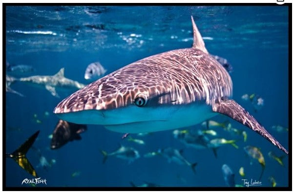 Realfish H2O Series: " in your face " Shark 24"x36" Floor Mat Realfish H2O floor mats are made from durable polyester needle punch material with a non-slip backing. Intended for indoor and light duty outdoor use. Coupled with our high-quality printing process, this mat illustrates an in-your-face closeup of a Shark that was photo captured by world renowned marine wildlife photographer Tony Ludovico.