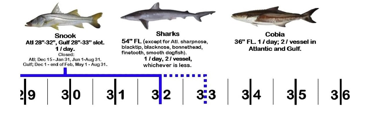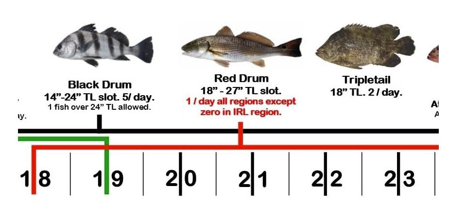 - Quick recognition of a slot fish with the highlighted lower and upper size limit brackets.