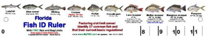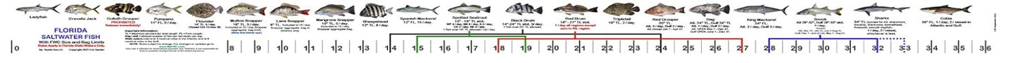 The Florida Boat Ruler Decal is unique among all the available boat ruler decals on the market. 20 common Florida saltwater fish are shown on this decal in high resolution true-to-life color photographs to make the identification of your catch a snap. The fish are arranged in a logical order according to their minimum legal size. Clear and concise FWC regulations for each species are shown in a large, crisp font for easy reading. There are color highlighted slot limit brackets for the red drum, spotted seatrout, black drum, and snook to aid in the recognition of a legal keeper fish. If the tail falls in the brackets, it's a keeper! The Florida Boat Ruler Decal is made of commercial grade vehicle wrap material with a 2-mil clear laminate overlay for extra durability and the inks are cured with UV light for sunlight and oil resistance.