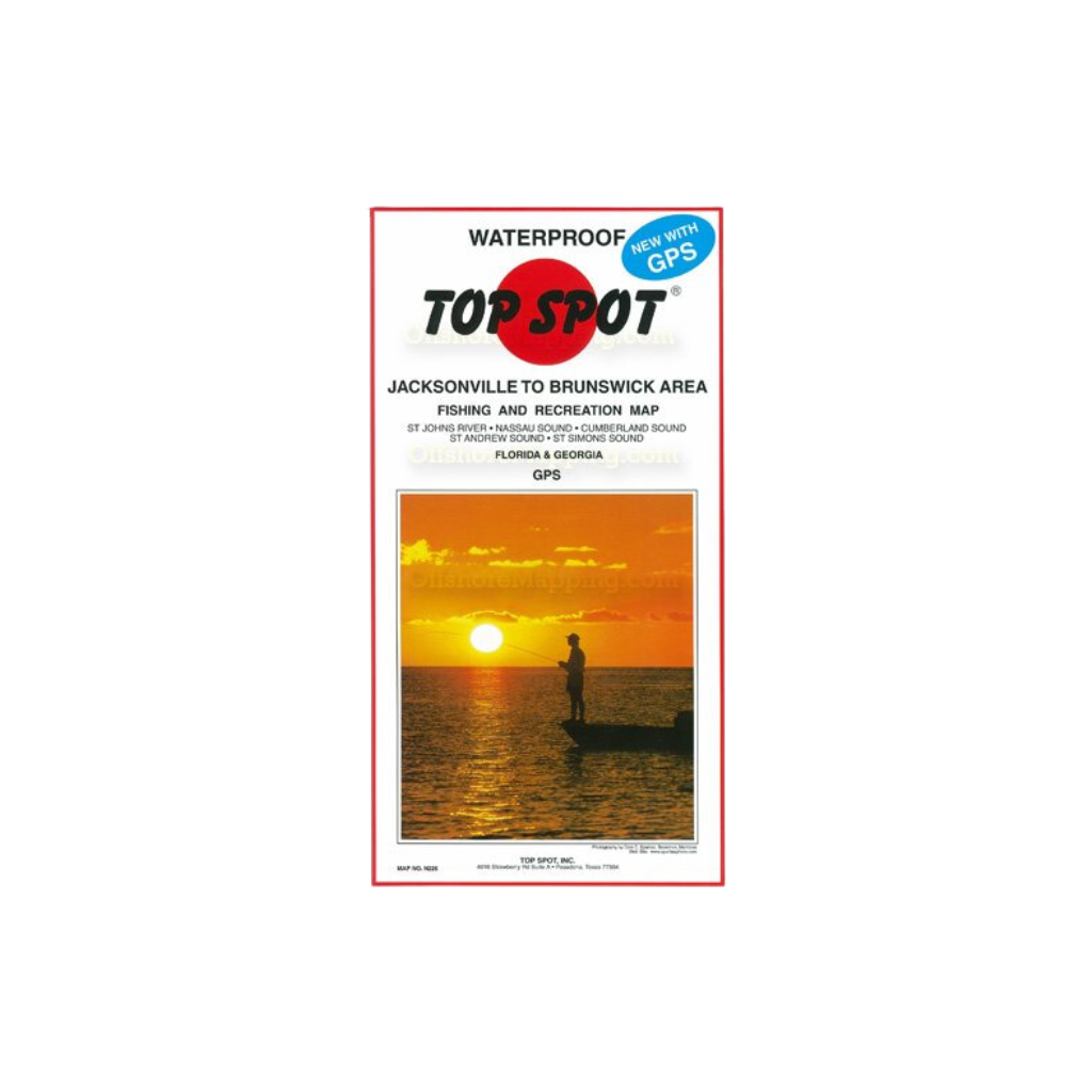 Jacksonville to Brunswick including St. Mary's Area. Top Spot Fishing Maps are waterproof and include freshwater, inshore saltwater and offshore saltwater areas. Detailed information and GPS coordinates are provided for fishing locations, boat ramps, marinas and other points of interest.