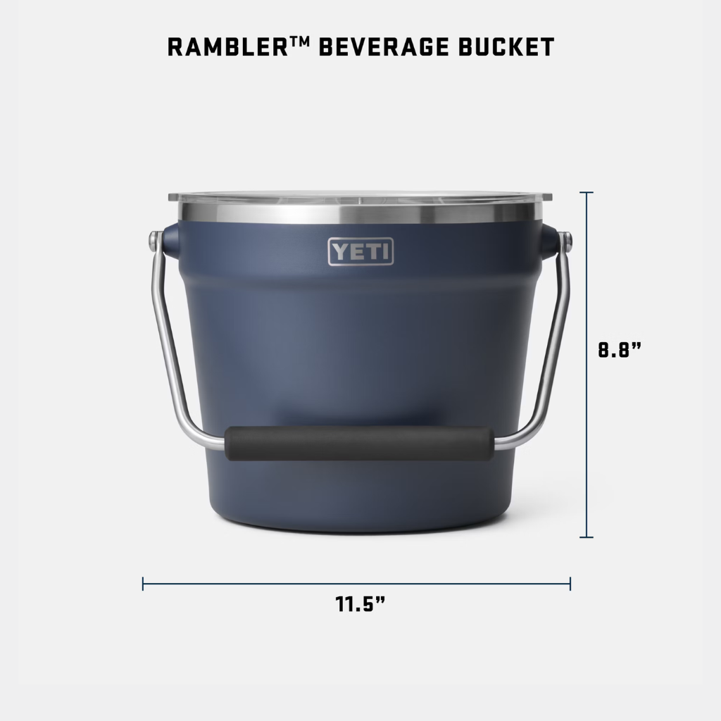 Pass around another round and bring the party to the wild. This durable stainless steel beverage bucket is part of the YETI® Rambler® Family. Its large capacity and rotating handle make it easy to haul a six pack or three bottles of wine, and the bucket keeps drinks cold all night long thanks to its double-wall vacuum insulation. Built for easy use, it comes equipped with a BearFoot™ Non-Slip Ring to avoid unwanted slips, clanks, and scratches and is dishwasher safe – because no one wants more work. With the lid in place it makes a great ice bucket for happy hours round the fire and is stackable for easy storage when the lid is removed Technology: 18/8 Kitchen-grade stainless steel construction is puncture and rust-resistant Double-wall vacuum insulation keeps ice longer and drinks colder BearFoot™ Non-Slip Ring helps avoid unwanted slips and scratches Features: Large capacity fits both cans and wine bottles Rotating handle allows for a strong grip while carrying Removable lid lets you easily stack for efficient storage Dishwasher safe for easy cleaning Dimensions: 11.5 in. W x 8.8 in. H Capacity: 256 oz.